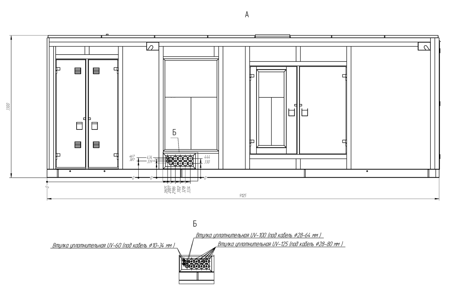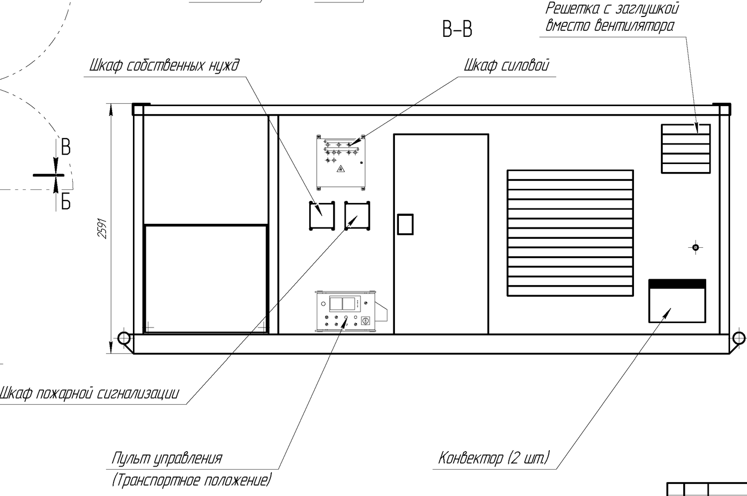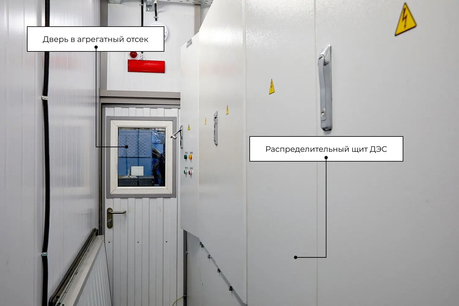 Блок-контейнеры разделены на отсеки: в топливном отсеке - топливный бак; в агрегатном отсеке - ДГУ, ящик аккумуляторных батарей, ручной топливозакачивающий насос; в электротехническом отсеке - щитовое оборудование систем автоматики управления и приборы охранной сигнализации. Отсеки разделены шумоизолированной перегородкой. Перегородка топливного отсека и дверь в соседний отсек имеют 2-ю степень огнестойкости. Каждый отсек имеет два эвакуационных выхода. В полотне дверей между отсеками предусмотрено смотровое окно из термостойкого стекла.
