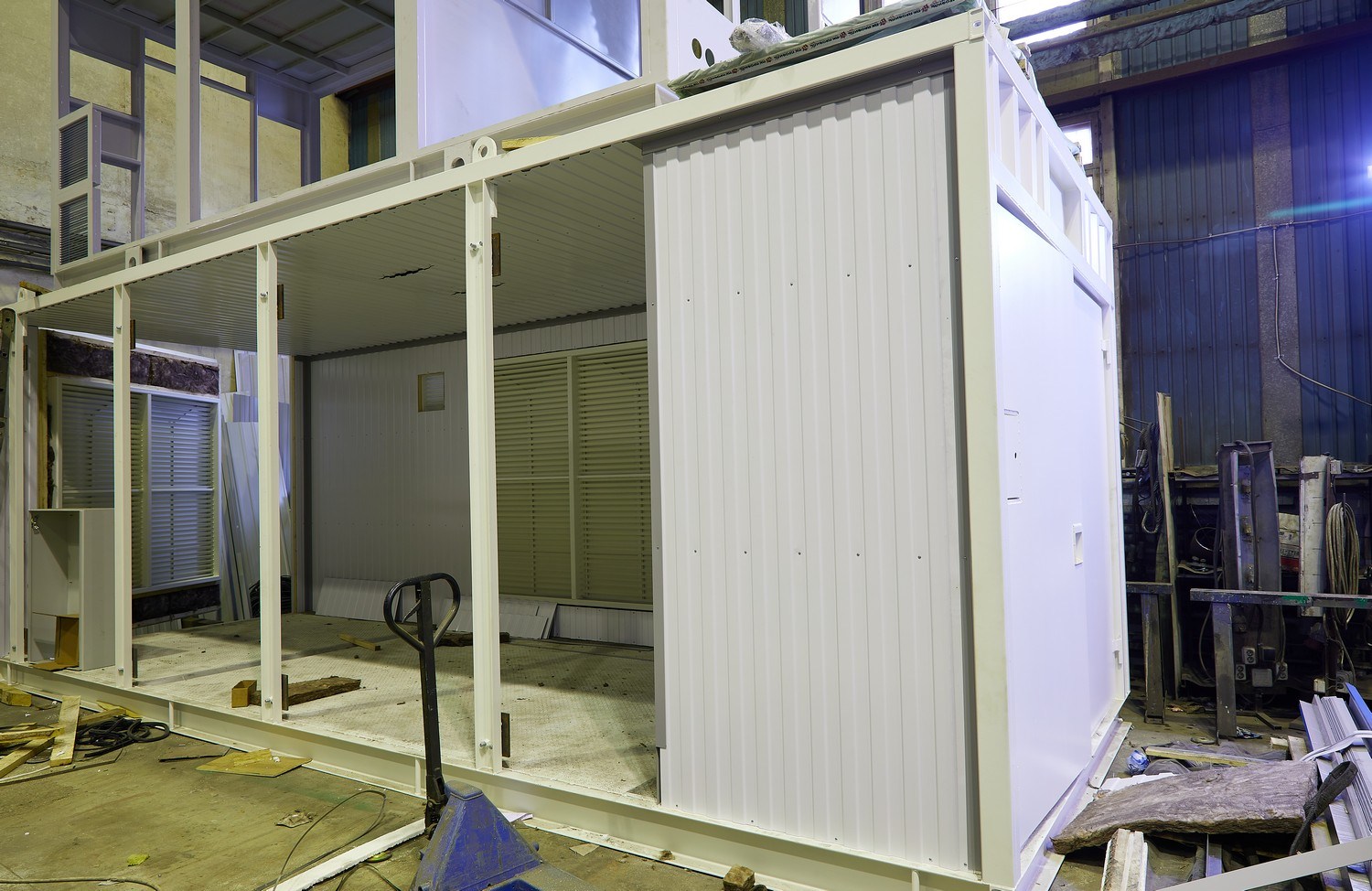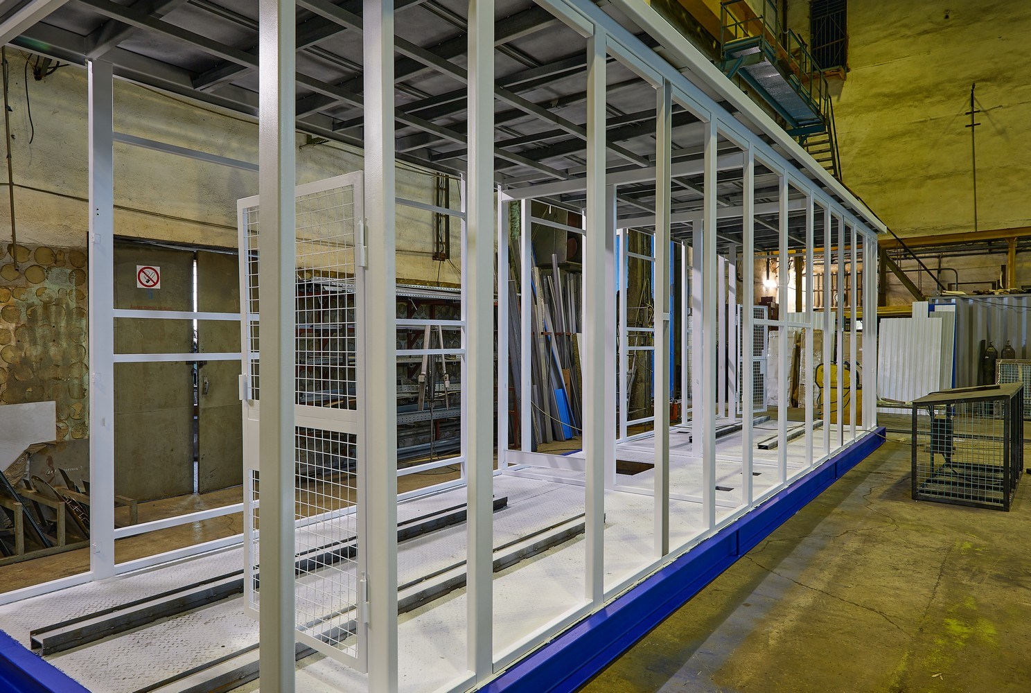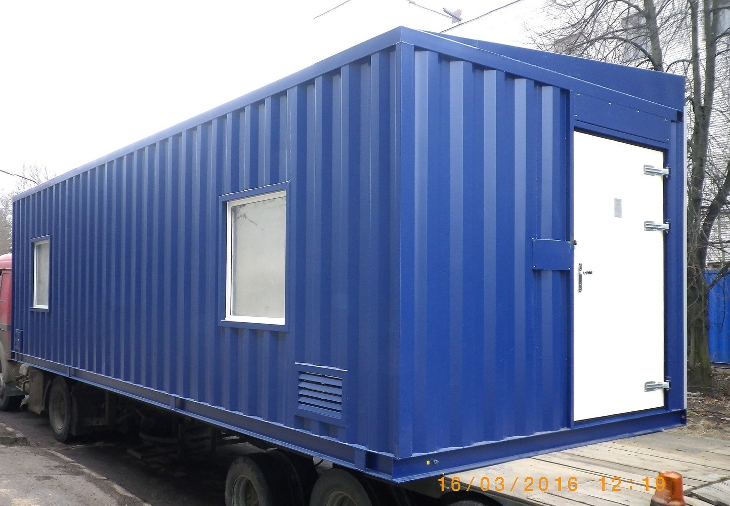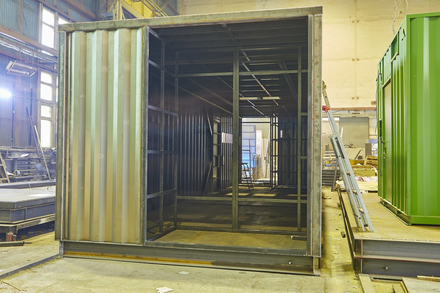 Наружная обшивка выполнена из профилированных листов стали толщиной 1,5 мм. Пол цельносварной, из рифленой стали толщиной 4 мм, приварен к металлическому основанию и прерывистым швом - к поперечным балка. Рифленый лист придает усиленную жесткость, что исключает нарушение геометрии и расхождение узлов при транспортировке и погрузке. Внутренняя обшивка стен и потолка выполнена профилированным металлическим листом светло-серого цвета. Крышки проемов - из стального листа толщиной не менее 1,5 мм, оборудованы фиксаторами для открытого положения и щеколдами для закрытого положения.