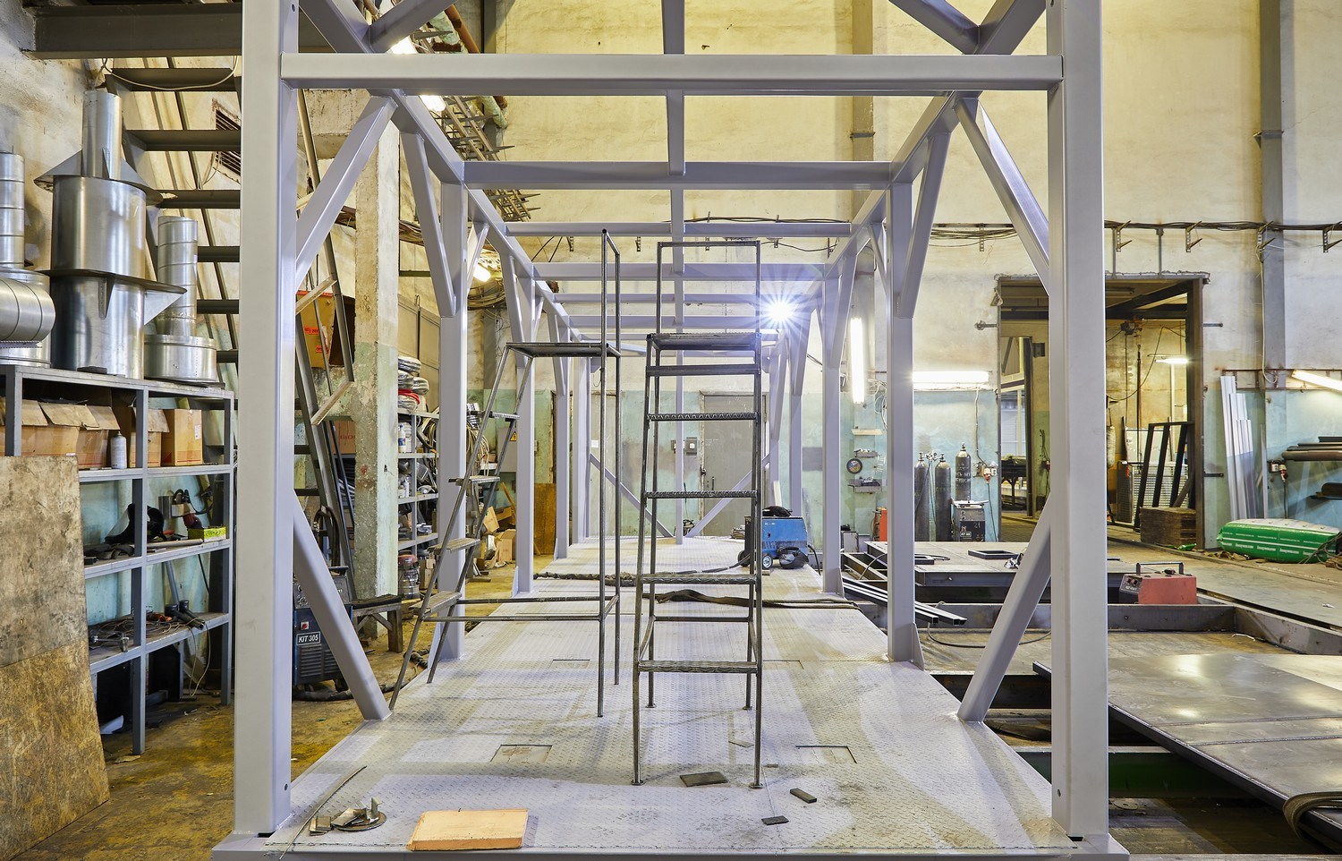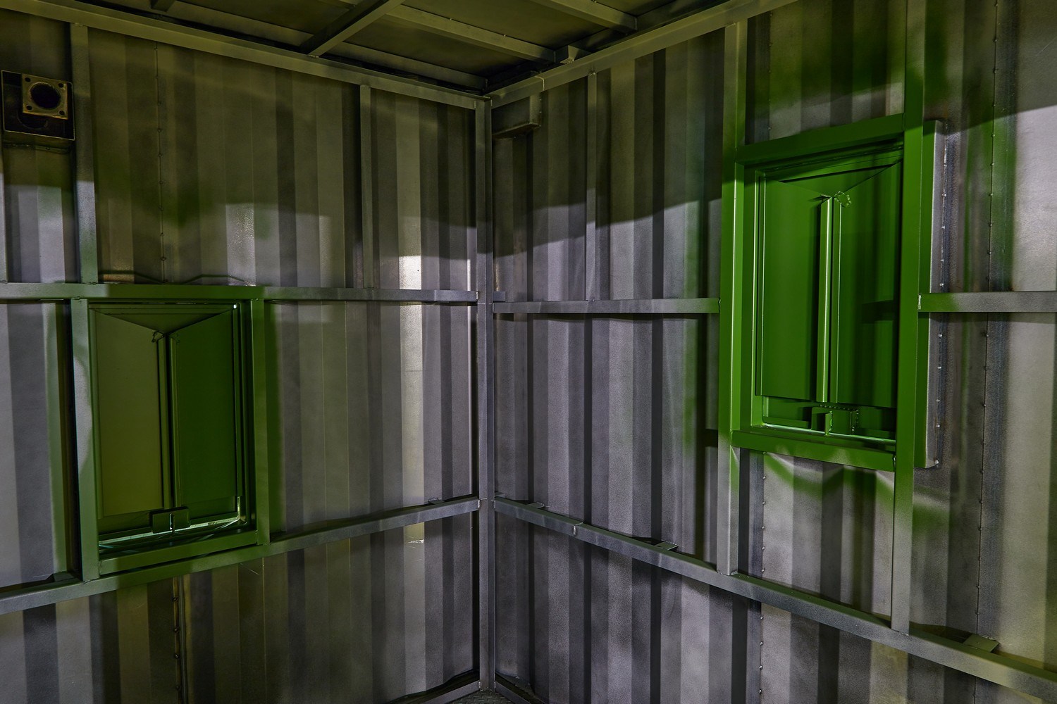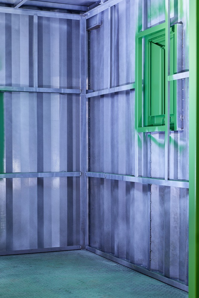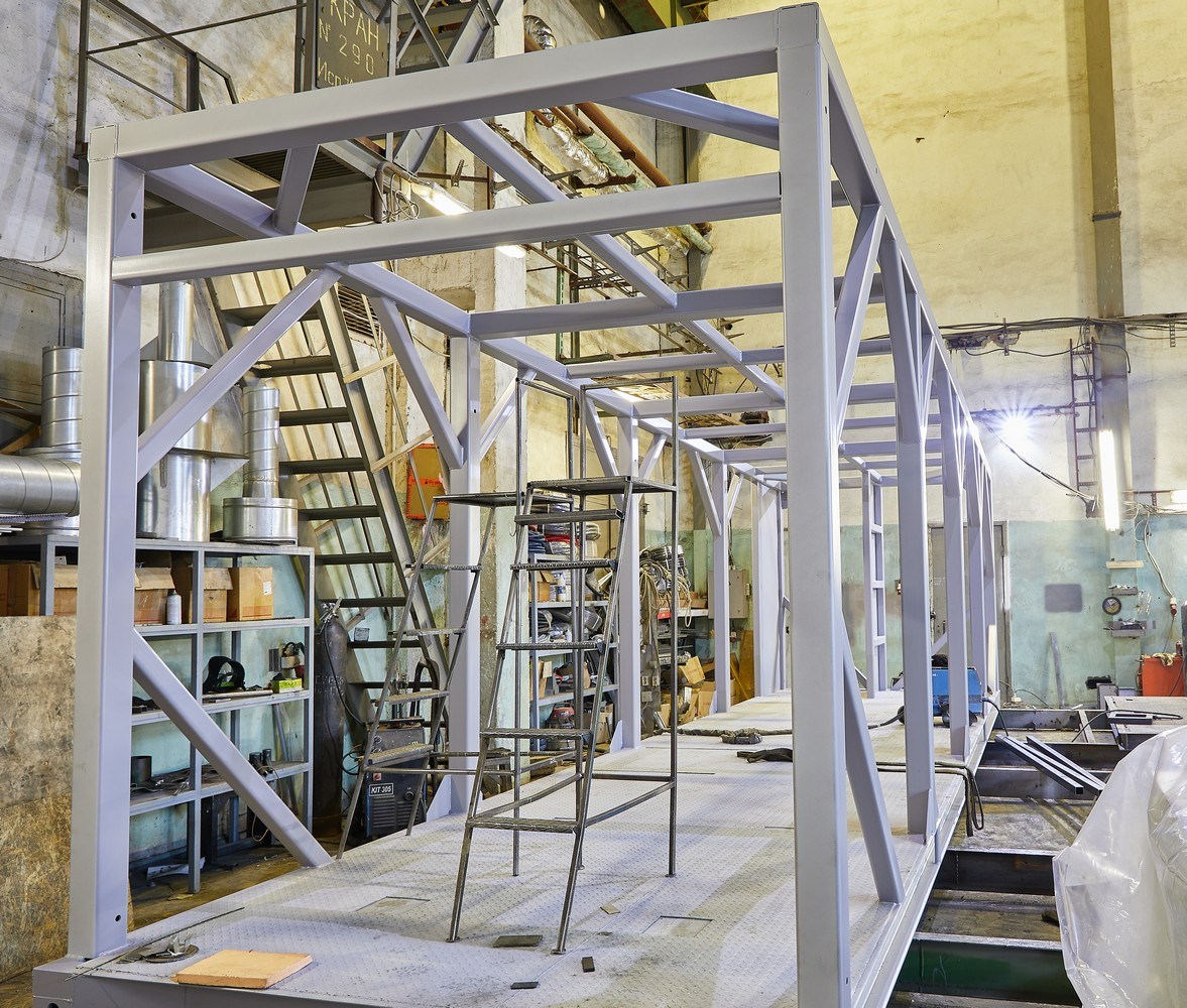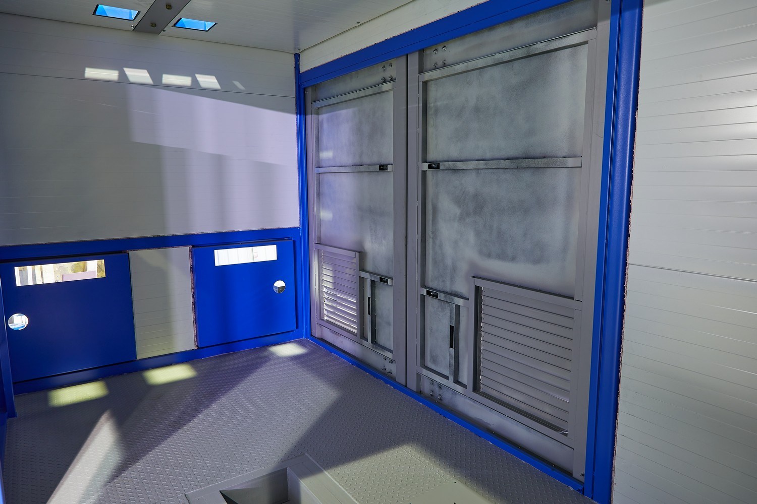 Наружная обшивка выполнена из профилированных листов стали толщиной 1,5 мм. Пол цельносварной, из рифленой стали толщиной 4 мм, приварен к металлическому основанию и прерывистым швом - к поперечным балка. Рифленый лист придает усиленную жесткость, что исключает нарушение геометрии и расхождение узлов при транспортировке и погрузке. Внутренняя обшивка стен и потолка выполнена профилированным металлическим листом светло-серого цвета. Крышки проемов - из стального листа толщиной не менее 1,5 мм, оборудованы фиксаторами для открытого положения и щеколдами для закрытого положения.