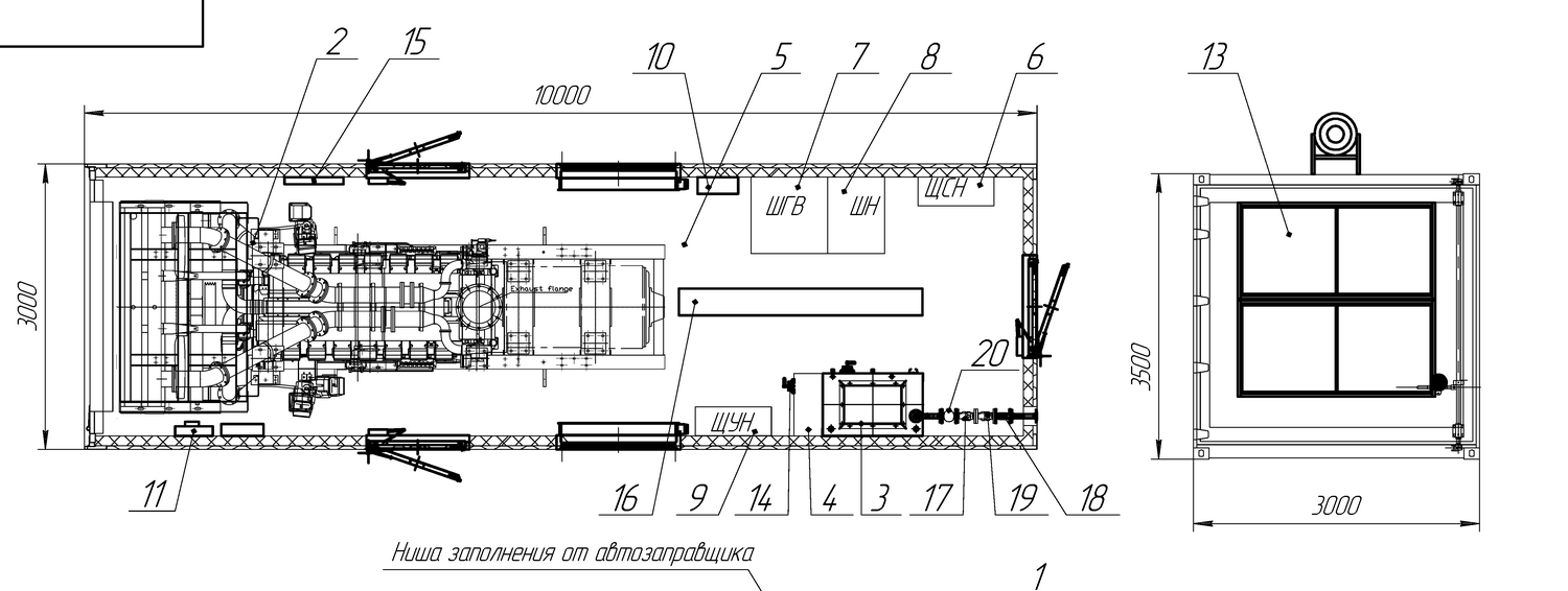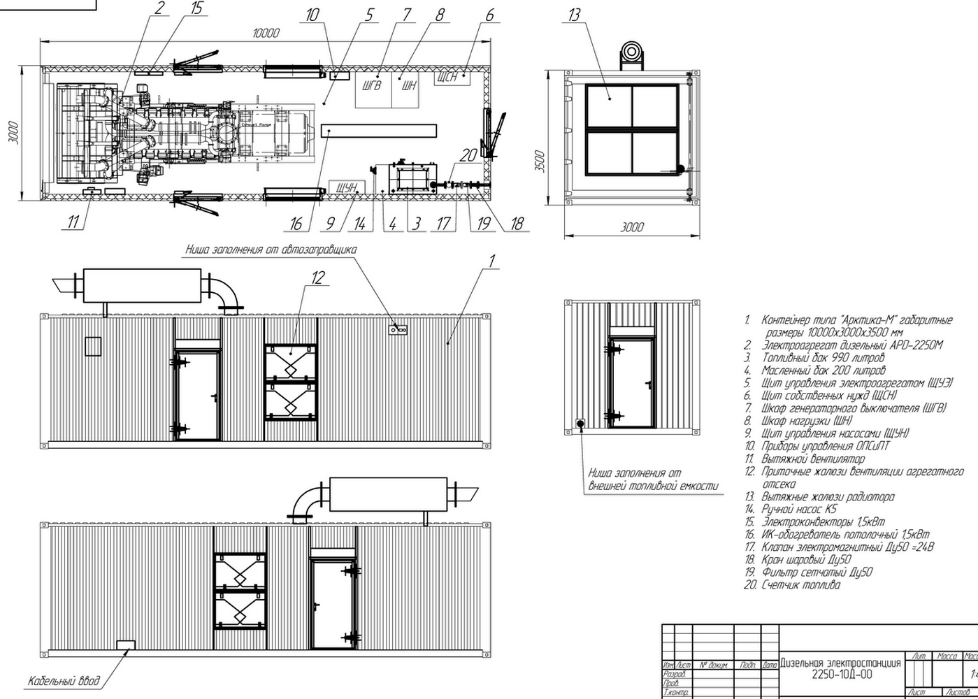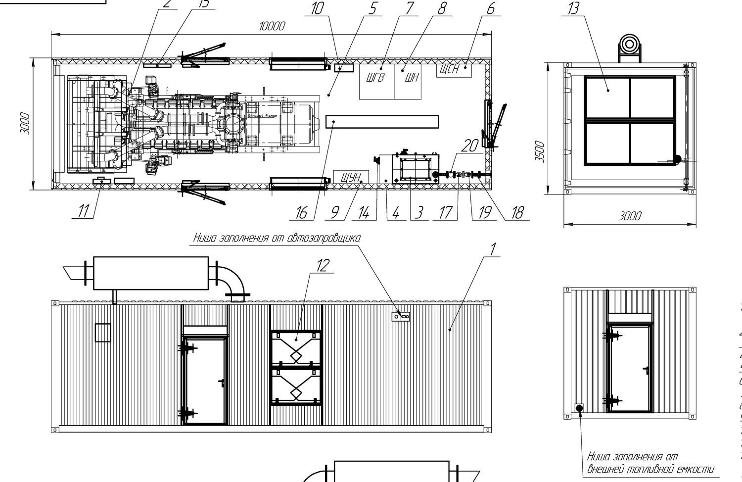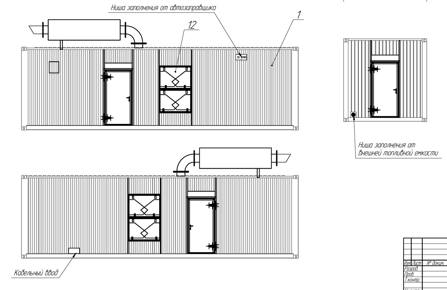 По ТЗ для производства контейнеров изготовим силовой шкаф (ШС), шкаф АВР, систему дистанционного мониторинга и управления, дополнительный топливный бак объемом до 15000 л.