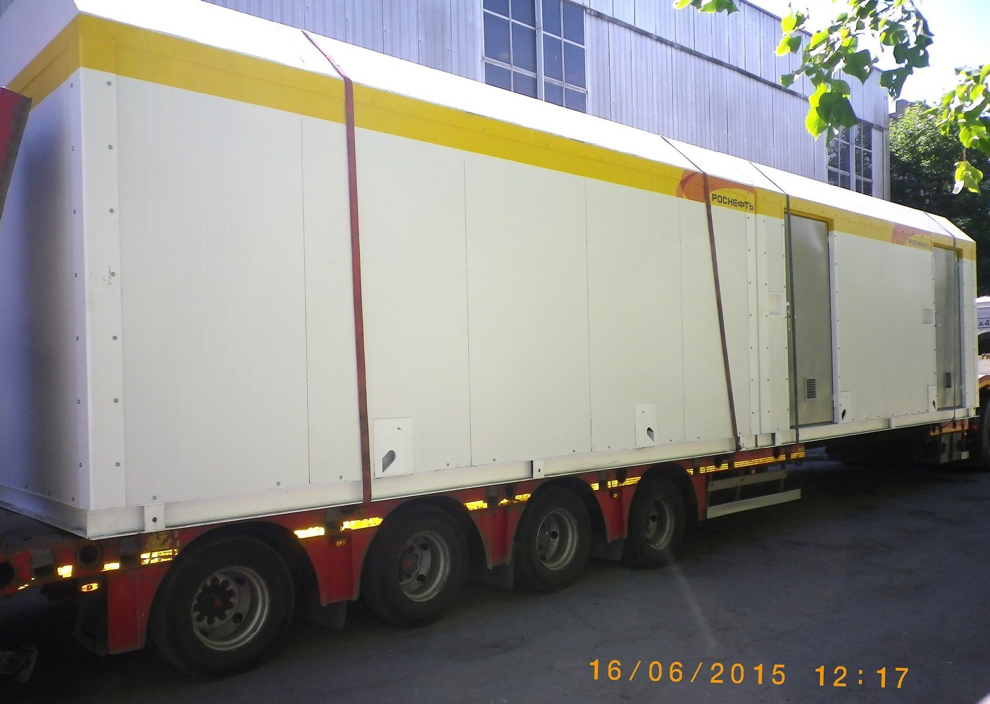 На производстве "Техэкспо" был изготовлен металлический цельносварной контейнер для газотурбинной электростанции. Блок разделен на два отсека - агрегатный отсек и электротехнический отсек с размещением высоковольтных ячеек. Габариты: 11500х2500х2800 мм.
