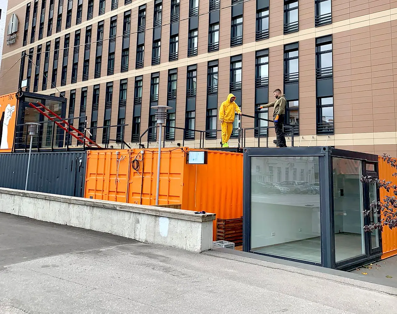 Возможно объединение контейнеров стяжными болтами и креплениями, а также изменение конструкции стандартного кафе из контейнера: демонтаж распашных дверей, устройство оконных и дверных проёмов, устройство откидных козырьков над окнами на петлях, монтаж террасы, выполненной по аналогии с конструкцией контейнера, имеющей подъёмно-опускной механизм. Наружный контур строения выполнен из металла. Стены, пол и потолок утеплены утеплителем толщиной 50 мм. Изнутри выполнена отделка деревом. Оконные заполнения — двухкамерный стеклопакет. Дверные заполнения — металл.