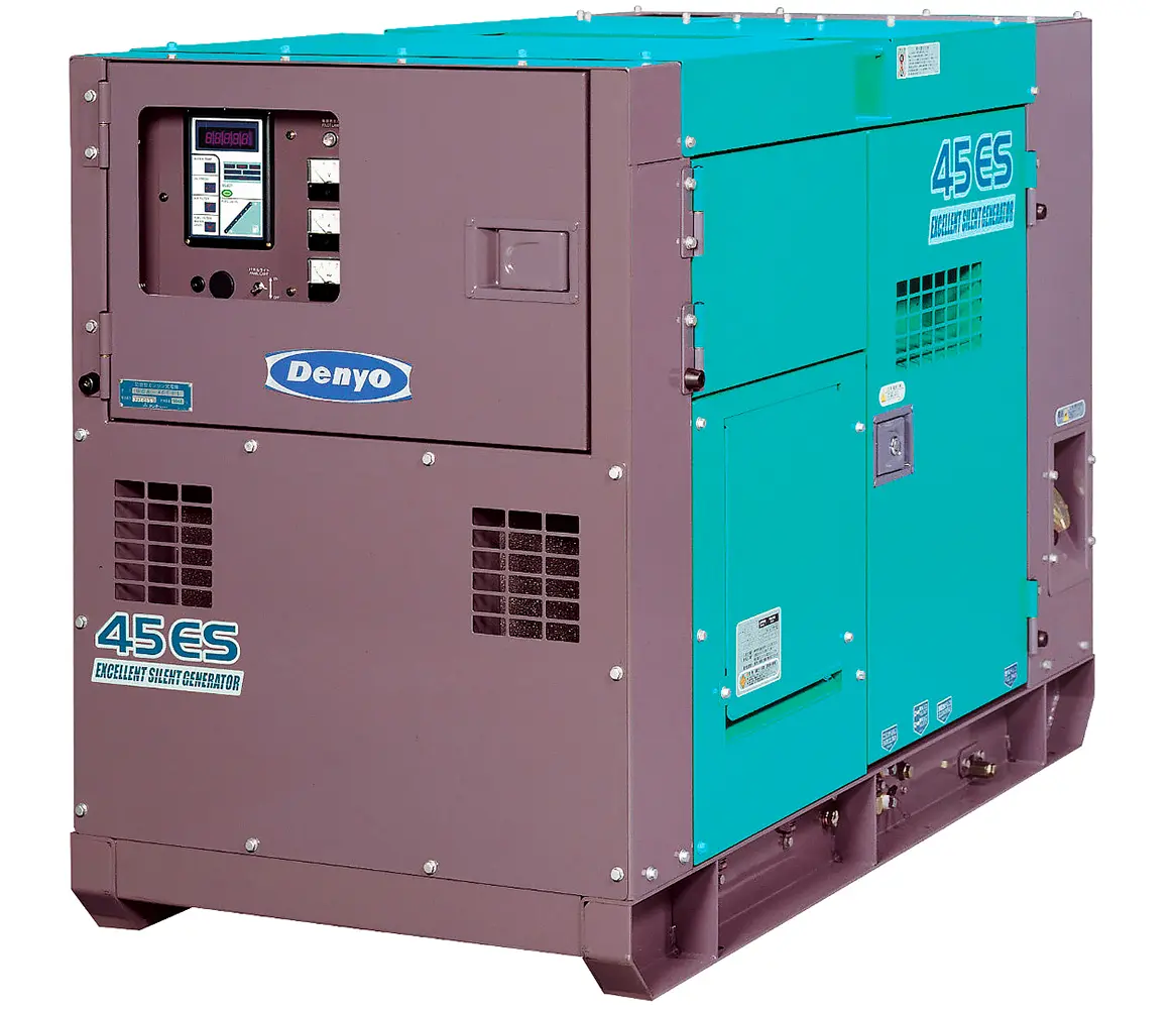 Компактная дизельная электростанция DENYO DCA-44ESI (габариты: 1900х860х990 мм.) мощностью 30 кВт выполнена на базе двигателя ISUZU BB-4JG1T (Япония). ДГУ закрытого исполнения в шумозащитном всепогодном кожухе, который обеспечивает уровень шумового давления в 60 дБ.