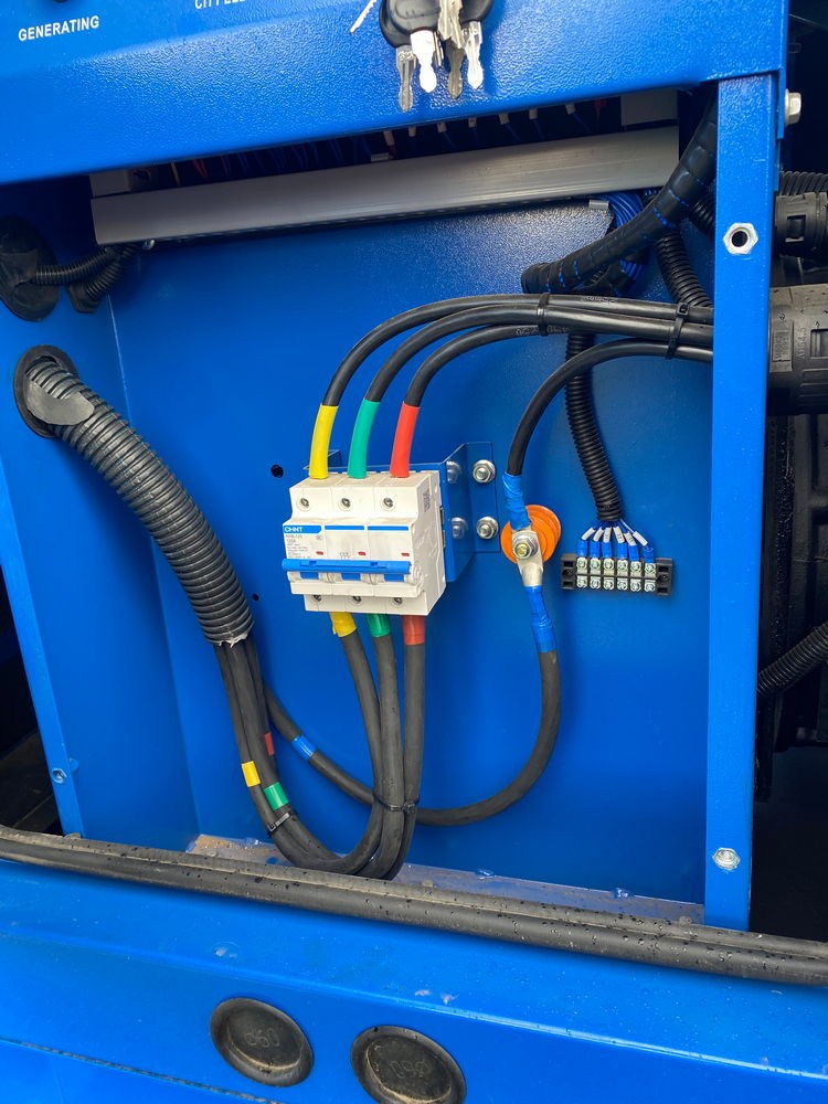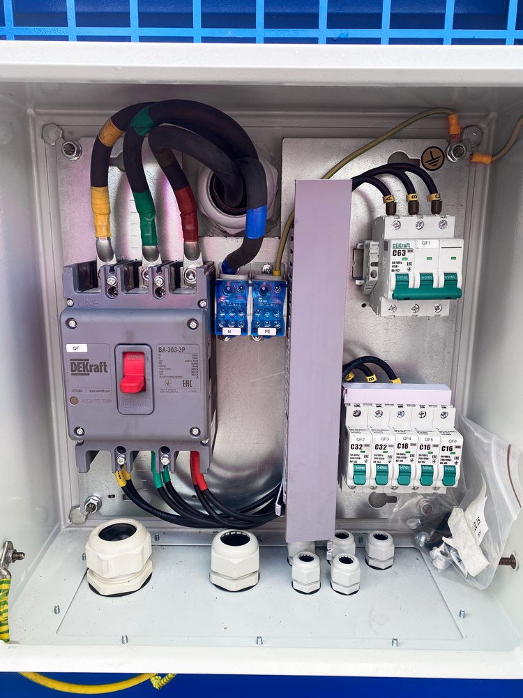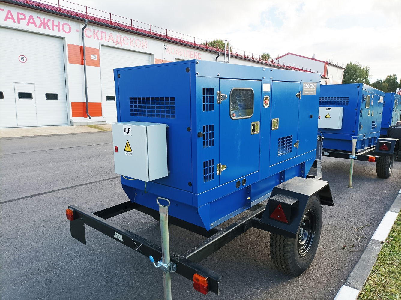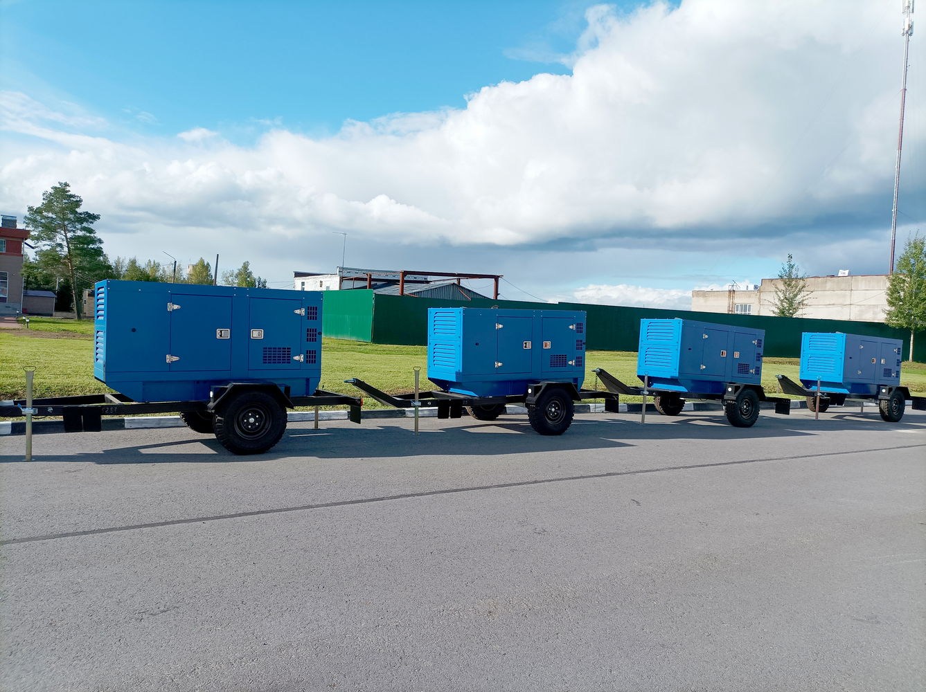 ДГУ мощностью 60 кВт каждая изготовлены во всепогодном кожухе и установлены на автомобильный полуприцеп. Для двух ДГУ смонтированы распределительные шкафы в составе: вводный автомат (125, 3ф), выключатель автоматический, система заземления, кабель и кабельная линия для подключения к шкафу, отходящая линия.