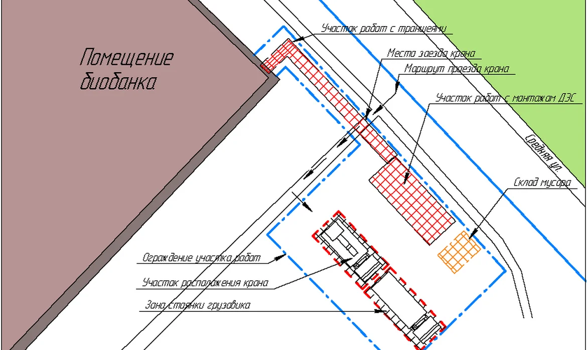 Земляные и строительно-монтажные работы по прокладке кабельных линий, в том числе демонтаж существующего асфальтового покрытия, бурение отверстий в стене здания помещений биобанка. |
