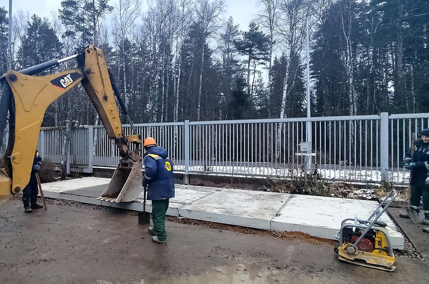 - Выполнен монтаж бетонных плит для фундамента под ДГУ: под плитами подстилающий слой из щебня и слой из песка. В итоге получена надежная опора для фундамента, не подверженная пучению, усадке, сжатию. Перед монтажом плит установлен бордюрный камень, свободное расстояние между бордюрном камнем и бетонными плитами залито бетоном. Выполнен контур заземления.