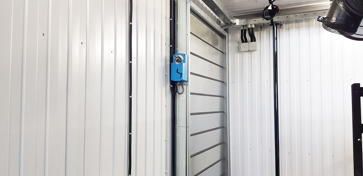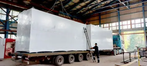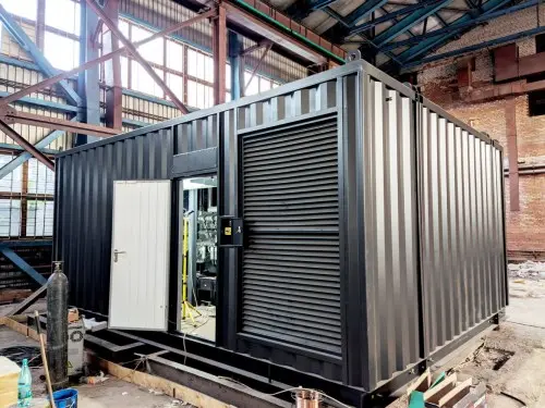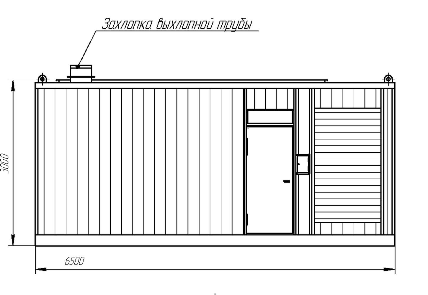 Цельносварной контейнер имеет составную конструкцию, в сборе его габариты составляют 6500х5000х3000 мм. Особенность конструкции – смонтированный внутри контейнера глушитель ДГУ. Наружная поверхность газовыхлопных трубопроводов ДГУ в местах возможного доступа обслуживающего персонала изолирована негорючим материалом, узлы прохода газовыхлопного трубопровода изолированы относительно стенок контейнера и защищены от атмосферных осадков. Над местом размещения ДГУ предусмотрена съемная крыша.