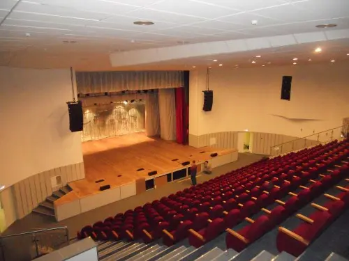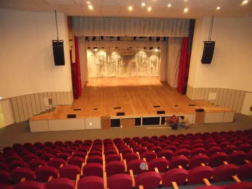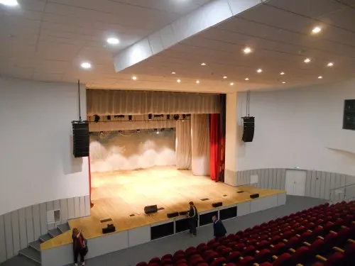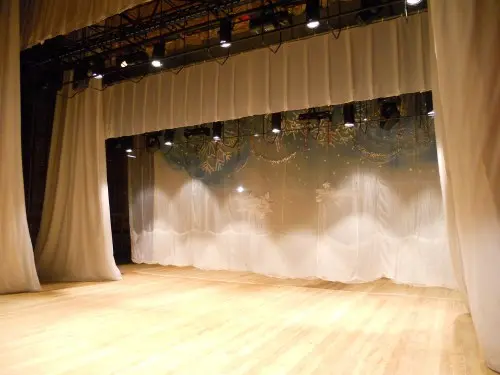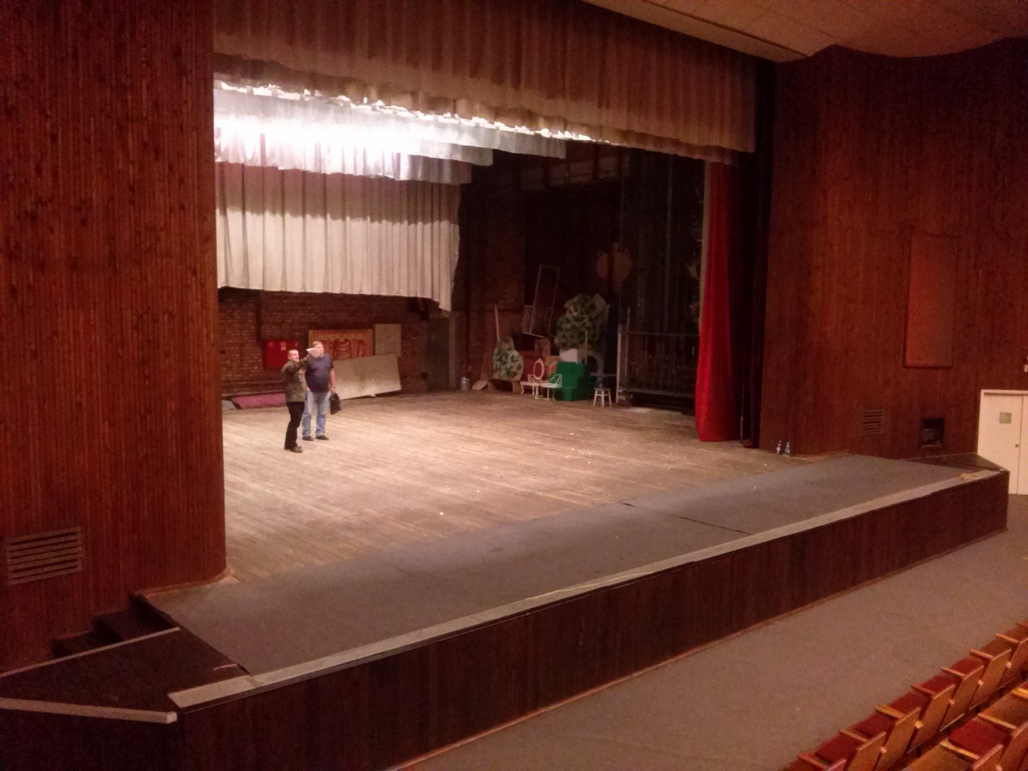 Для пола сцены и зрительного зала была выполнена укладка лаг по кирпичным столбикам. Напольное покрытие сцены устроено из доски лиственницы высокого качества. Такой материал износостойкий и выдерживает большую нагрузку. В зрительном зале на древесностружечные плиты был постелен ковролин.