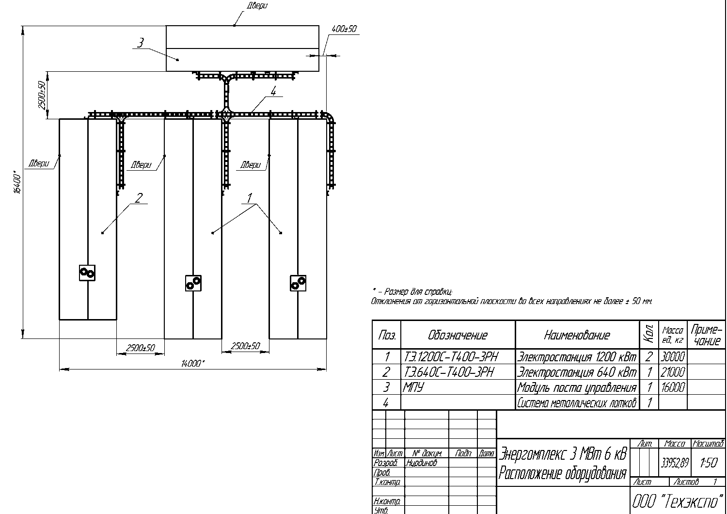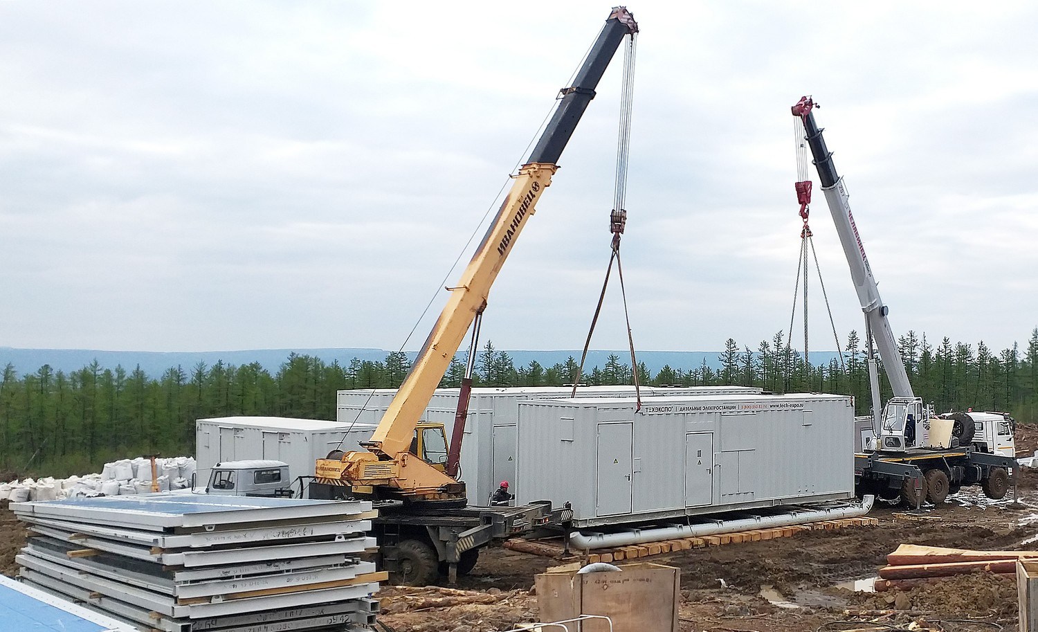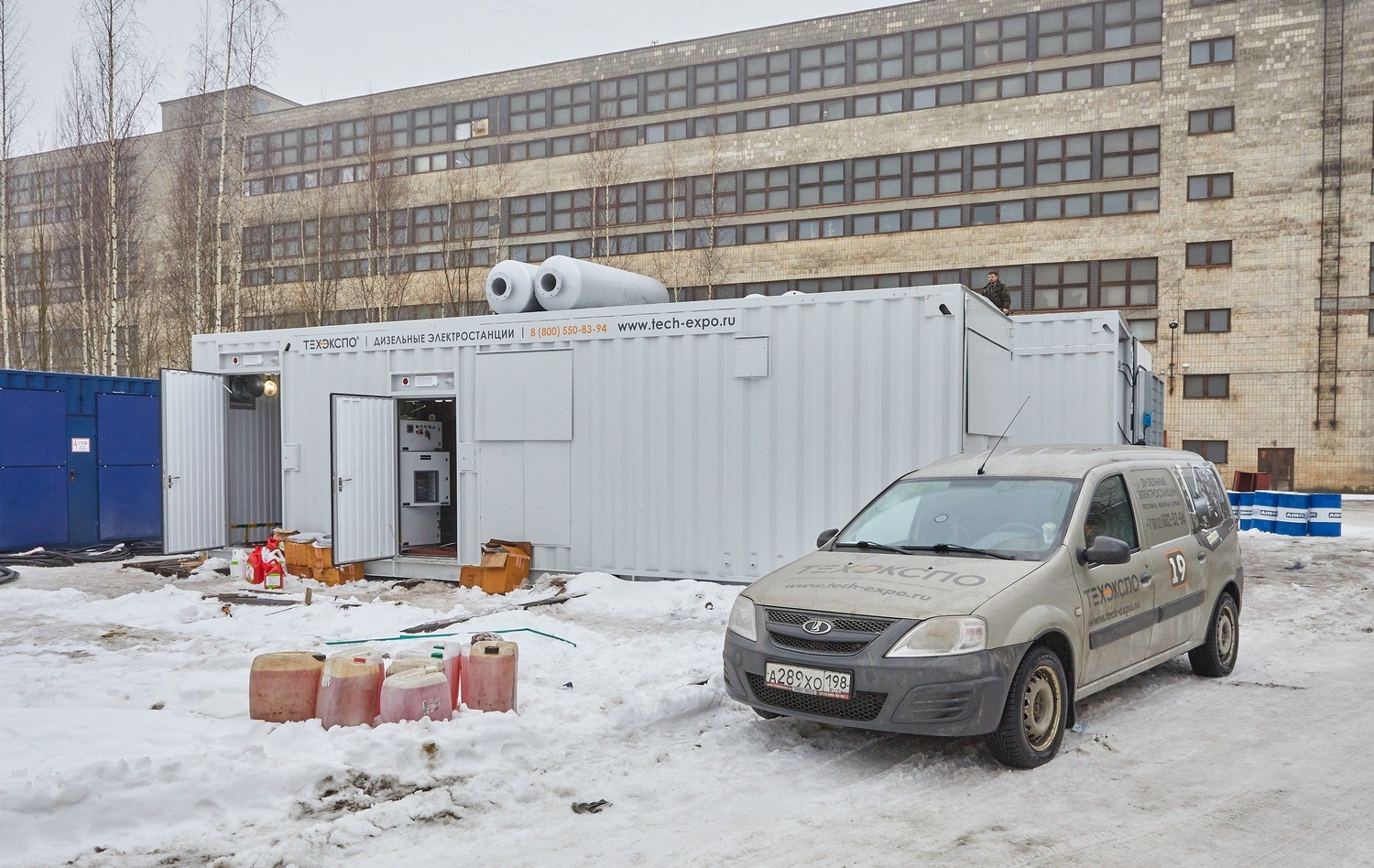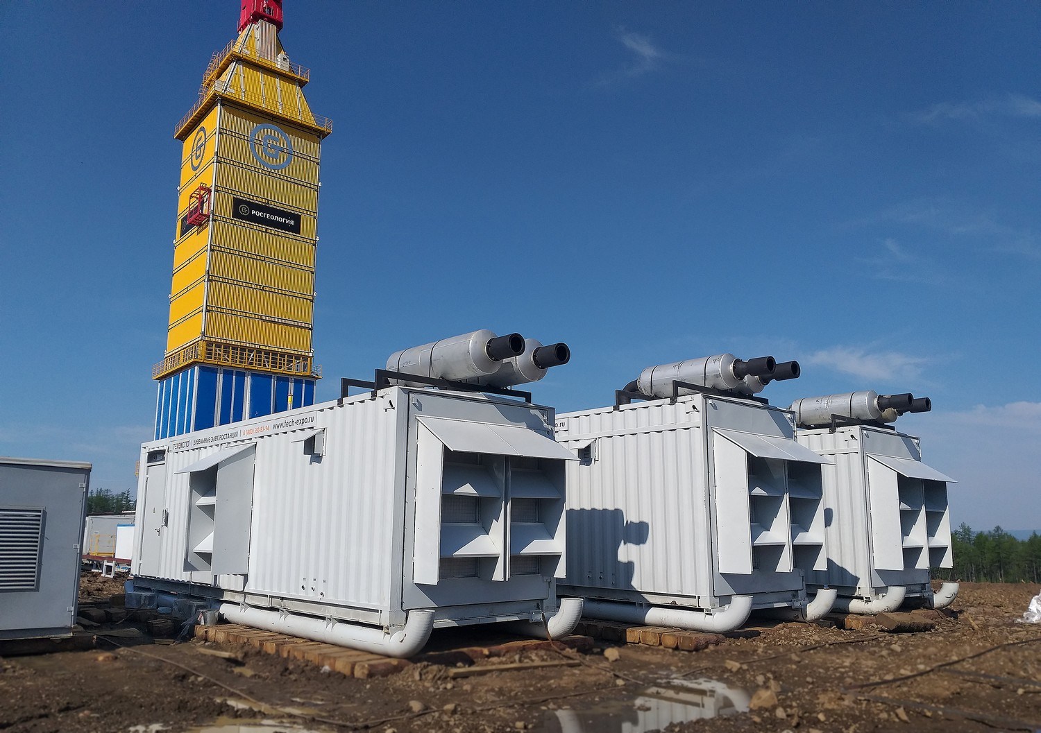 В 2021 г. ООО «Техэкспо» изготовило энергокомплекс на базе ДГУ Cummins суммарной мощностью 3 МВт для электроснабжения буровой установки на скважине Канандинская (Эвенкия, Таймыр) холдинга АО «Росгеология». Энергокомплекс изготовлен в четырёх контейнерах (собственного производства «Техэкспо») габаритами 12500х2450х3000 мм на полозьях (салазках) и предназначен для использования в качестве основного источника электроснабжения буровой установки по линии 6,3 кВ. Энергокомплекс состоит из трех ДГУ Cummins (две по 1200 кВт и одна – 640 кВт), трансформаторов 6,3/0,4 кВ, модуля управления и вспомогательного оборудования (площадки, лестницы, перила, лотки, кабельная продукция межмодульных связей, высоковольтный кабель КГЭ-ХЛ 3Х95-6кВ, ЗИП и инструменты для ДГУ на 4500 часов). |
