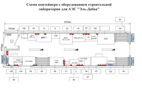 Лаборатория состоит из контейнера с камерой нормального твердения (КНТ), комплекта приборов, оборудования для проведения лабораторных испытаний и лабораторной мебели рабочего места для сотрудников лаборатории.