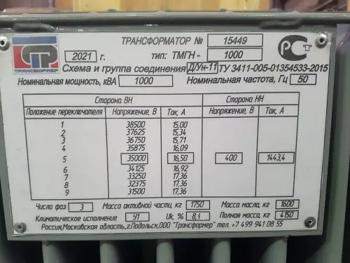 ООО «Техэкспо» поставило в 2021 г. для ЛАЭС-2 специальный масляный трансформатор ТМГН-1000/35У1, 35+- 4Х2,5%/0,4 кВ (AI/AI), группа соединения Д/Ун-11,8.