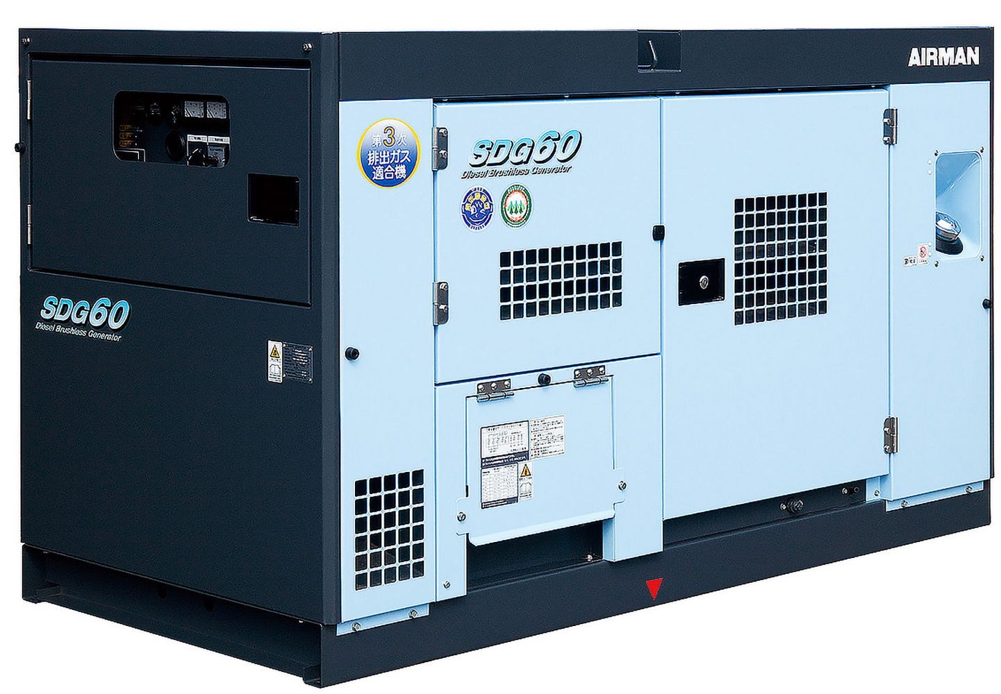 Дизельная электростанция Airman SDG60S (Япония) имеет номинальную мощность 40кВт (50 кВА), расход топлива при 100% нагрузке - 15.1 л/час. Максимальная автономия при нагрузке 75% - 11.9 ч. Масса - 1120 кг.
