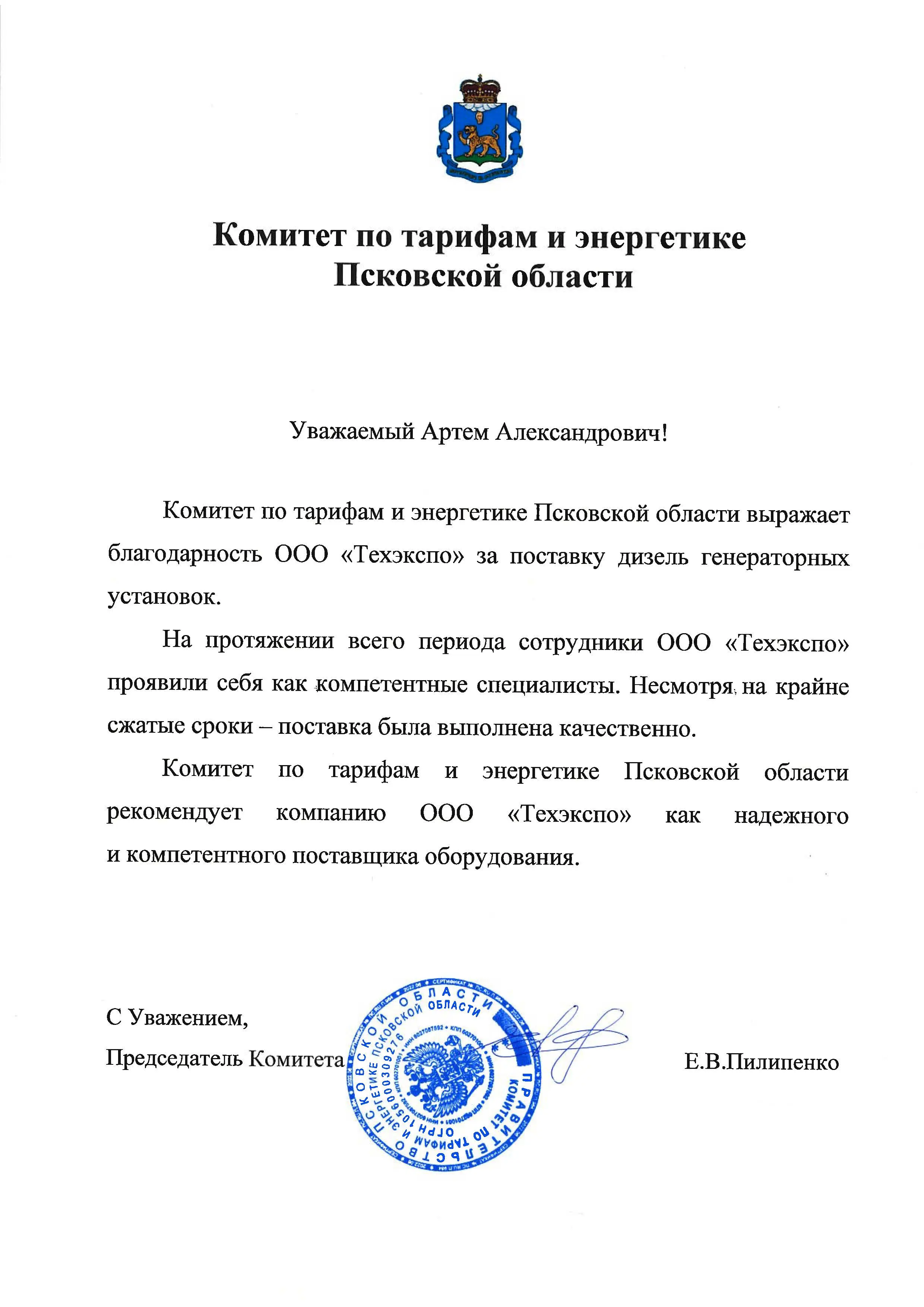 | Отзыв | «Мы выражаем благодарность компании «Техэкспо» за поставку дизель-генераторных установок. Специалисты компании проявляли свою компетентность на протяжении всего периода нашего сотрудничества. Несмотря на крайне сжатые сроки поставка была выполнена вовремя». |