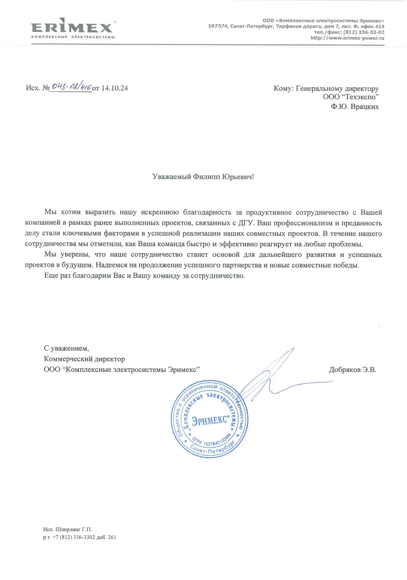 | Отзыв | «Мы хотим выразить нашу искреннюю благодарность за продуктивное сотрудничество с компанией «Техэкспо» в рамках выполненных проектов по поставкам ДГУ. Ваш профессионализм и преданность делу стали ключевыми факторами в успешной реализации наших совместных задач. В течение нашего взаимодействия мы отметили, как команда «Техэкспо» быстро и эффективно реагирует на любые рабочие моменты. Надеемся на продолжение нашего партнерства и новые совместные победы!» |
